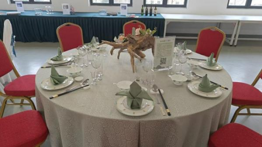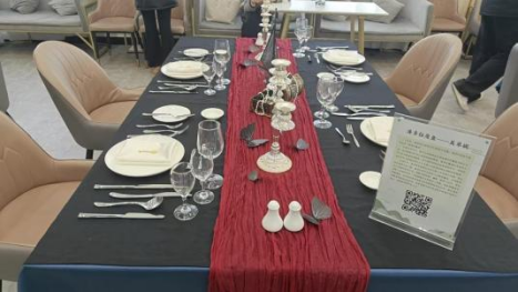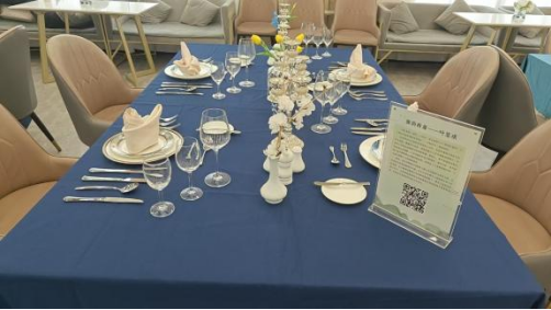 毕业生们在作品中深度结合餐饮服务规范与个性化美学表达,通过色彩叙事、材质对比与文化符号的巧妙运用,在遵循中西餐摆台礼仪的基础上,融入青花、生态、神话、禅意等多元意象。每件作品既体现专业技艺的严谨,也承载情感表达与价值思考,展现了从技能实践到美学创造、从文化理解到行业关怀的综合设计能力。