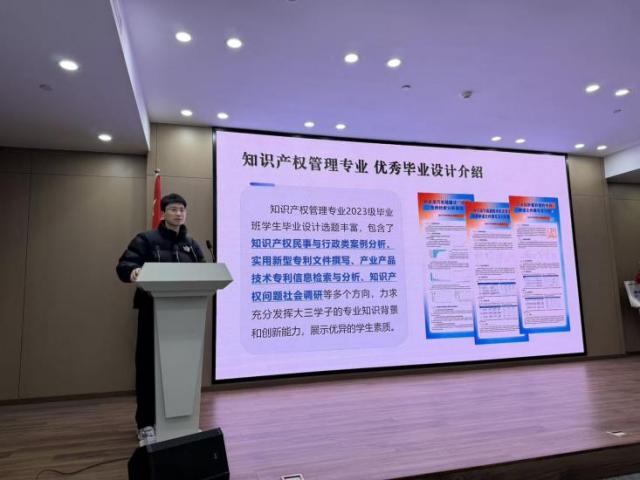 知识产权管理专业2023级学生围绕“知识产权民事与行政类案例分析”“实用新型专利文件撰写”“产业产品技术专利信息检索与分析”以及“知识产权问题社会调研”等方向展开深入研究。多项设计作品紧密结合当前知识产权保护热点与实务需求,体现了学生扎实的专业基础和解决实际问题的能力。