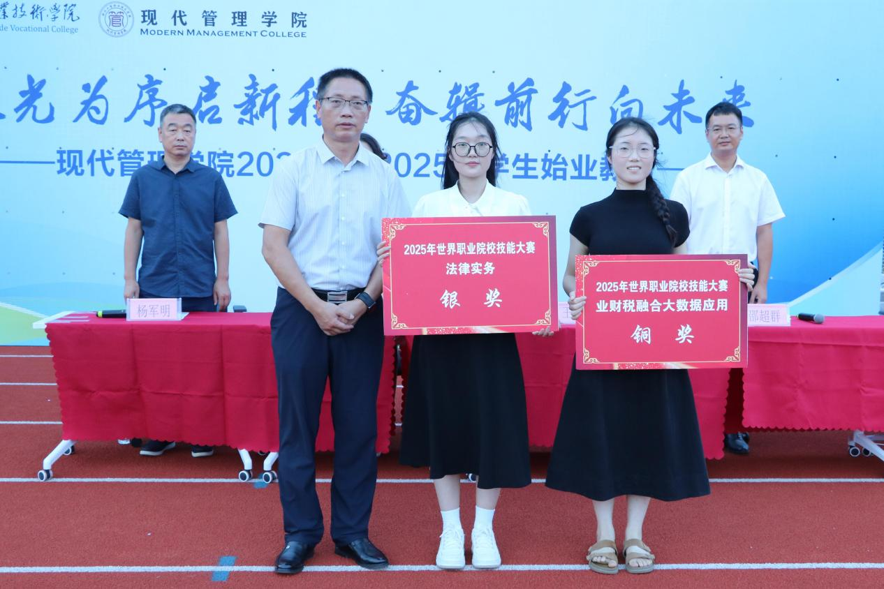 在颁奖环节,学院重点表彰了在2025年浙江省及世界职业院校技能大赛中获奖的团队与个人,以及暑期社会实践优秀队员。一张张荣誉证书、一次次热烈掌声,既是学子们拼搏奋斗的勋章,更彰显了现代管理学院“实践育人”的成效,为全体师生树立了“崇尚技能、勇于实践、担当有为”的榜样标杆,更激励着全院学子以先进为范,在成长道路上勇攀高峰、再创佳绩。