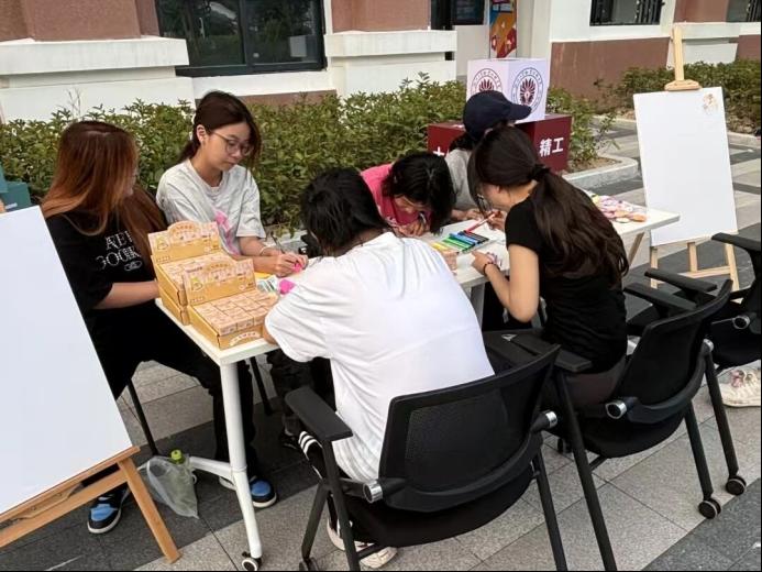 活动现场设置了“心情盲盒站”“情绪涂鸦板”和“正向能量场”三大特色互动区域,吸引了众多同学参与。在“心情盲盒站”,同学们将近期的烦恼与快乐匿名写在彩色卡片上,投入“焦虑回收站”与“快乐储蓄罐”,再随机抽取他人卡片手写暖心回复,在匿名交流中完成了双向治愈。“情绪涂鸦板”前,大家用五彩画笔和情绪贴纸自由创作,以色彩与图案直观表达内心感受,将无形情绪化为生动画面。“正向能量场”则提供了解压玩具DIY材料,同学们动手制作捏捏乐、黏土作品舒缓压力,同时通过盲抽励志书签获取精神鼓励,现场气氛轻松愉悦。