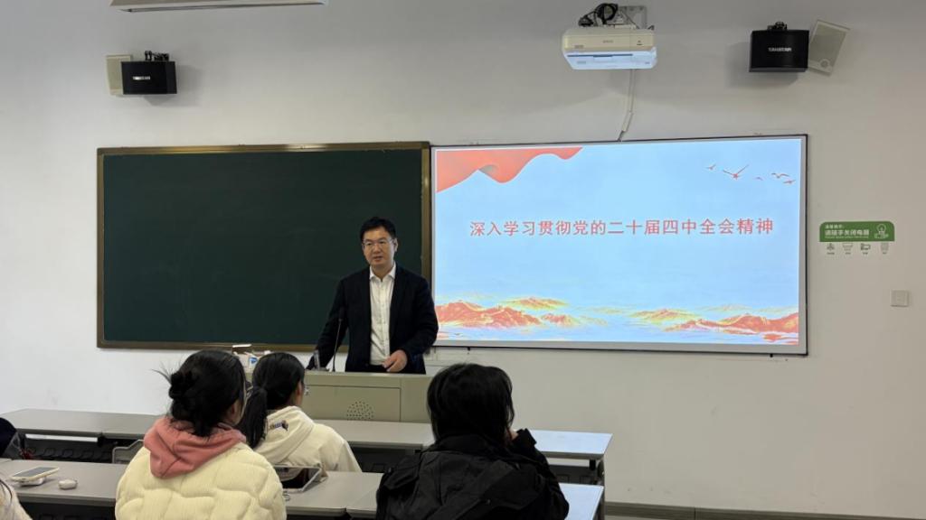 课堂伊始,邵超群书记以党的二十届四中全会精神为核心授课内容,结合全会公报原文展开系统解读。他从会议召开的时代背景、核心议题切入,清晰梳理了全会在推进国家治理体系和治理能力现代化进程中的重大意义,尤其聚焦基层党建与青年思想引领的新要求,向同学们提出明确期望:“要把全会精神融入日常学习与校园服务的每一处细节,用脚踏实地的行动响应时代号召。”